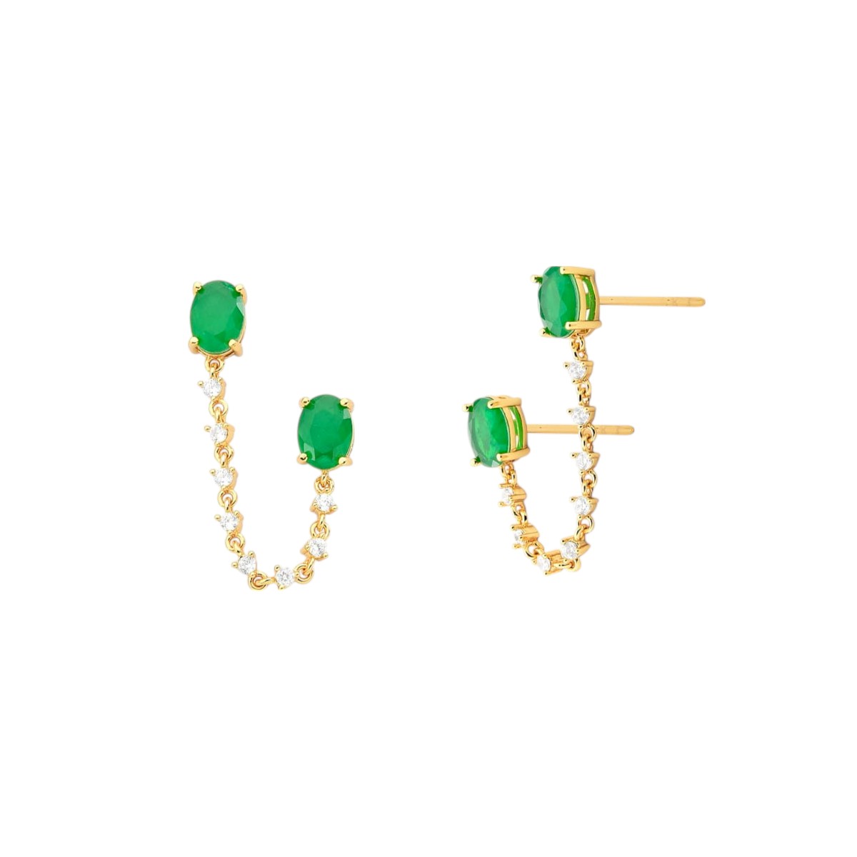 O brinco ear line com pedras verdes é a escolha perfeita para quem tem dois furos e busca um visual sofisticado com um toque de originalidade.