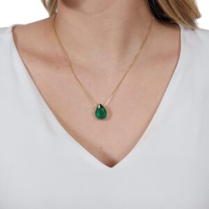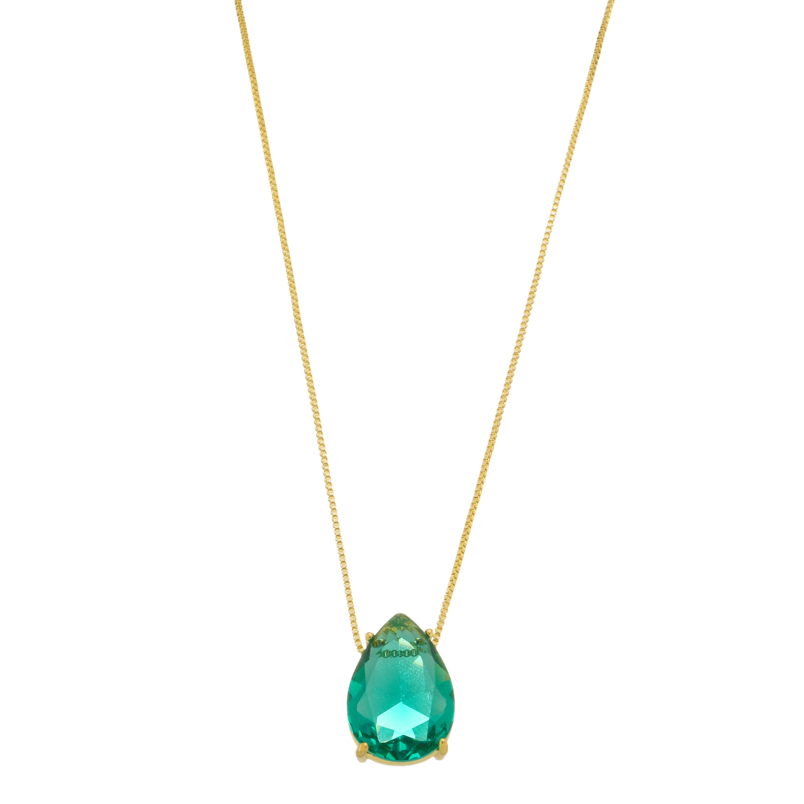 Seu pingente traz uma gota de zircônia verde luminosa, criando um contraste elegante com o banho de Ouro 18k, que confere à peça um toque de luxo atemporal.